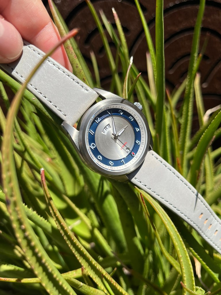 Firstly, I love the story behind the inspiration and what made Matthew Zillmann start Hz Watches’ (read the story here) and his toiling to get their first watch to market. Of course, being Australian owned and designed helped a tad too. Equally, the size (38.5mm case diameter, 46mm case length (lug to lug) and 9.85mm case height) of the watch with its tapered lugs maximises comfort and wearability. I’ve already mentioned the lightness and durability of the watch thanks to its titanium case, but there is also its 20mm wide quick-release leather strap which matches the watch quite well. There are also the other bits where the attention to detail is quite exquisite, like the stepped tuxedo dial that adds depth and contrast, highlighting each aspect of the dial, and also the sunburst portion of the dial and how catches and reflects light – creating different effects under different lighting conditions – its very eye catching. Oh yeah, the red tipped seconds hand is a nice touch too.