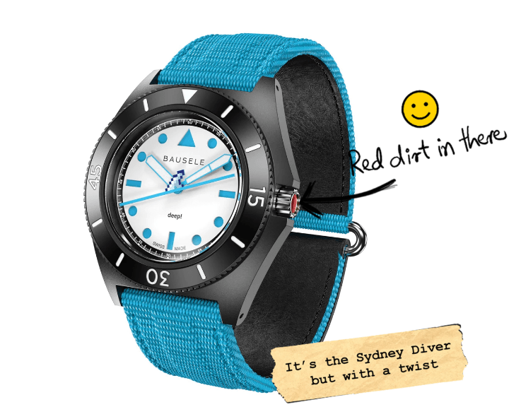As mentioned, this is a limited edition to 50 numbered pieces only for each dial color (white or black), crown at 3H filled with the Kimberley red dirt (close to cap Leveque), glow in the dark Super Luminova hands and numerals. When it comes to straps, there is the choice between the one elastic light blue Nato and one black strap made of recycle material. Oh yeah, the heart of this collab watch beats the Sellita SW200 Automatic self winding movement – a total workhorse caliber.