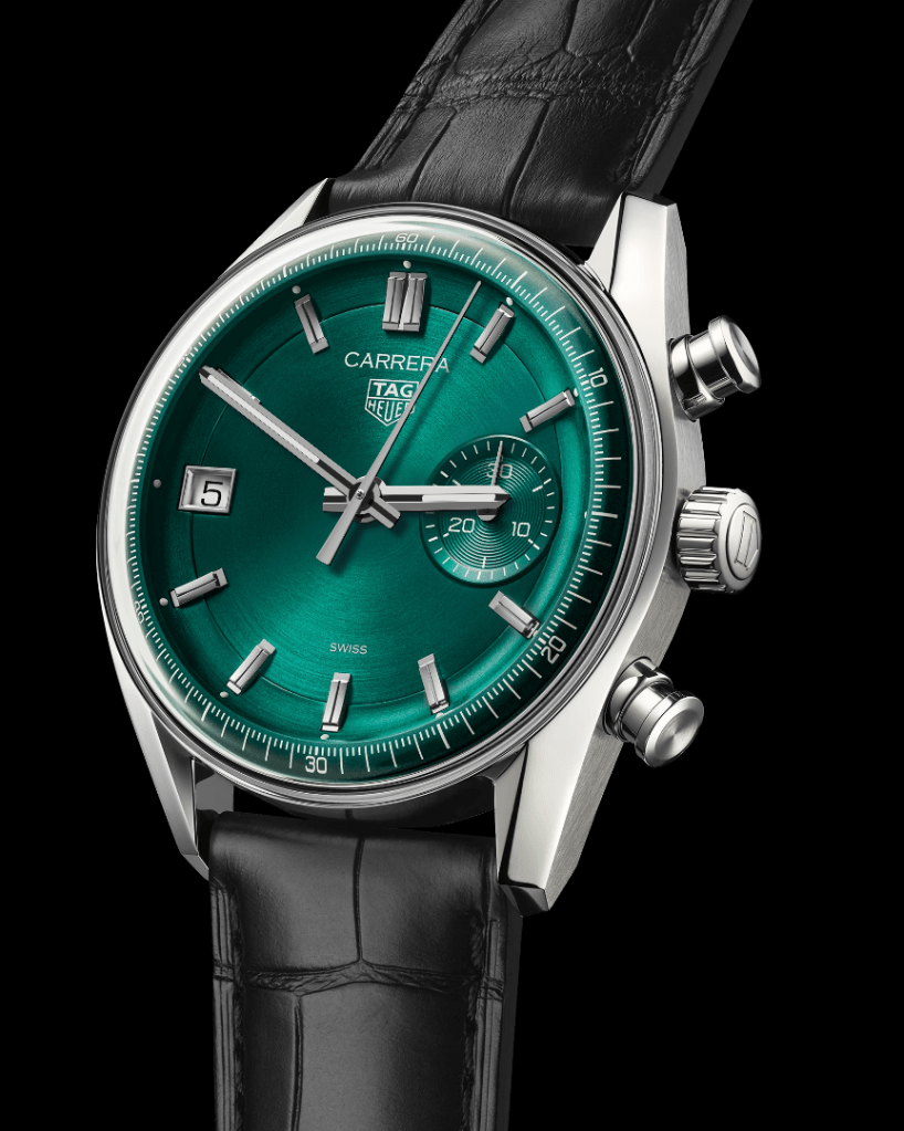 - Features a new gorgeous teal green dial, a date window at 9 o’clock and a single 45-minute chronograph counter at 3 o’clock.