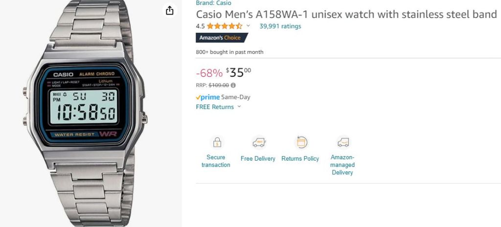 First cab off the rank is the Casio Men’s A158WA-1 at $35 – a whopping 68% off it’s usual price!