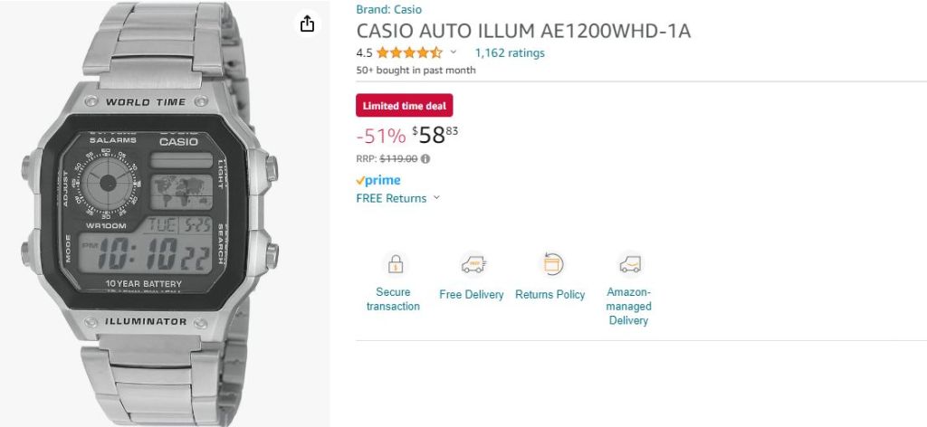 Everyone’s favourite square(ish) Casio, the AE-1200WHD-1A is now $58.83, which is half the usual retail price.