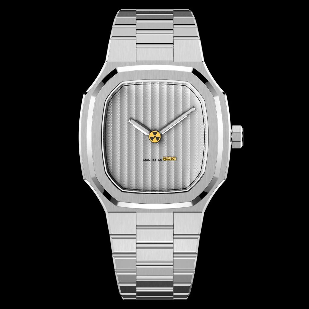 By erasing the dial and modifying the seconds hand, we wanted to symbolize nuclear nothingness and life-threatening consequences of the Manhattan Project.