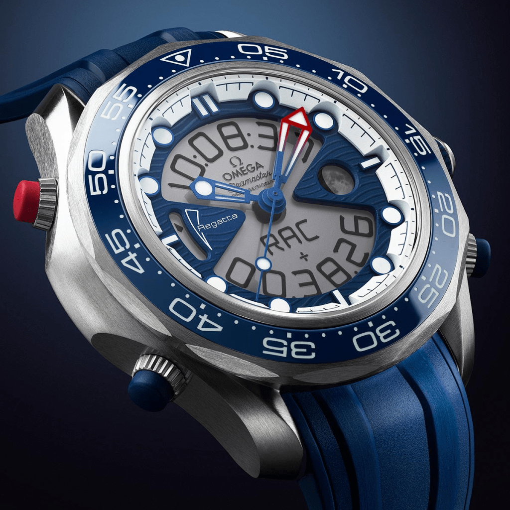 The 46.75 mm Seamaster Regatta is more than just a watch—it’s a multifunctional instrument built for precision on the water. Showcasing OMEGA’s expertise in both design and functionality, the timepiece features both analogue and digital displays, making it a versatile tool for professional sailors and enthusiasts alike.