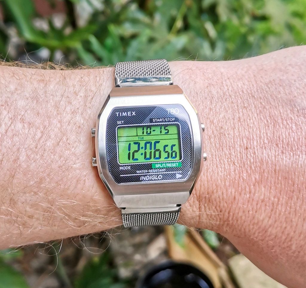 To me the bigger case on the Timex feels more true to vintage digis so round one goes to the T80.
