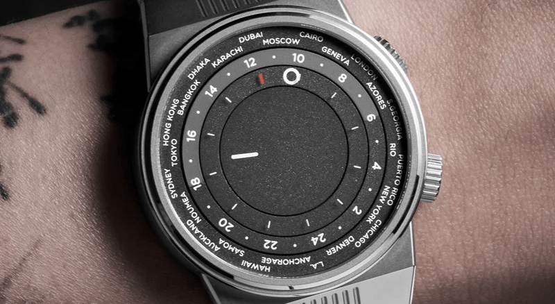 Dial: Grained matte grey with speckled finish, 3 concentric dials representing hours, minutes and world time, 24 time zones printed on outermost disk
