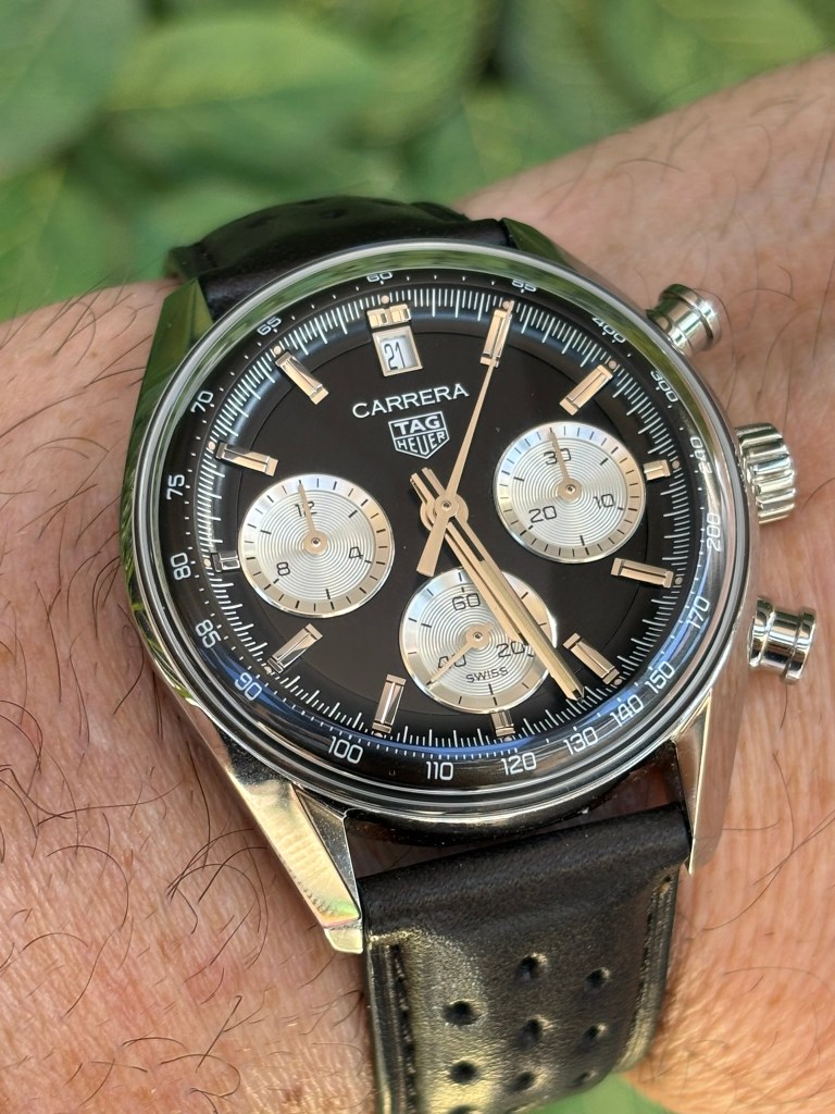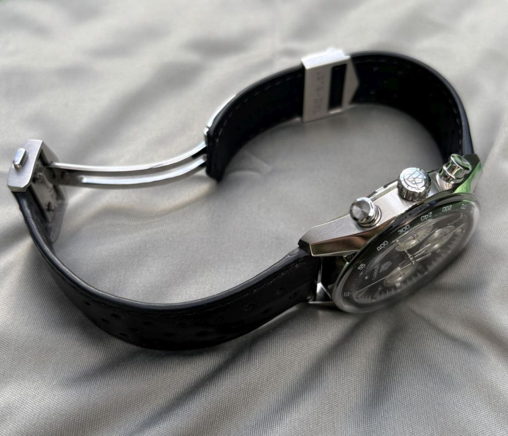 - The Case: At 39mm, it hits the “Goldilocks” zone. It feels substantial yet disappears under a shirt cuff, retaining the sharp, faceted lugs that have defined the Carrera since Jack Heuer first sketched them in 1963.